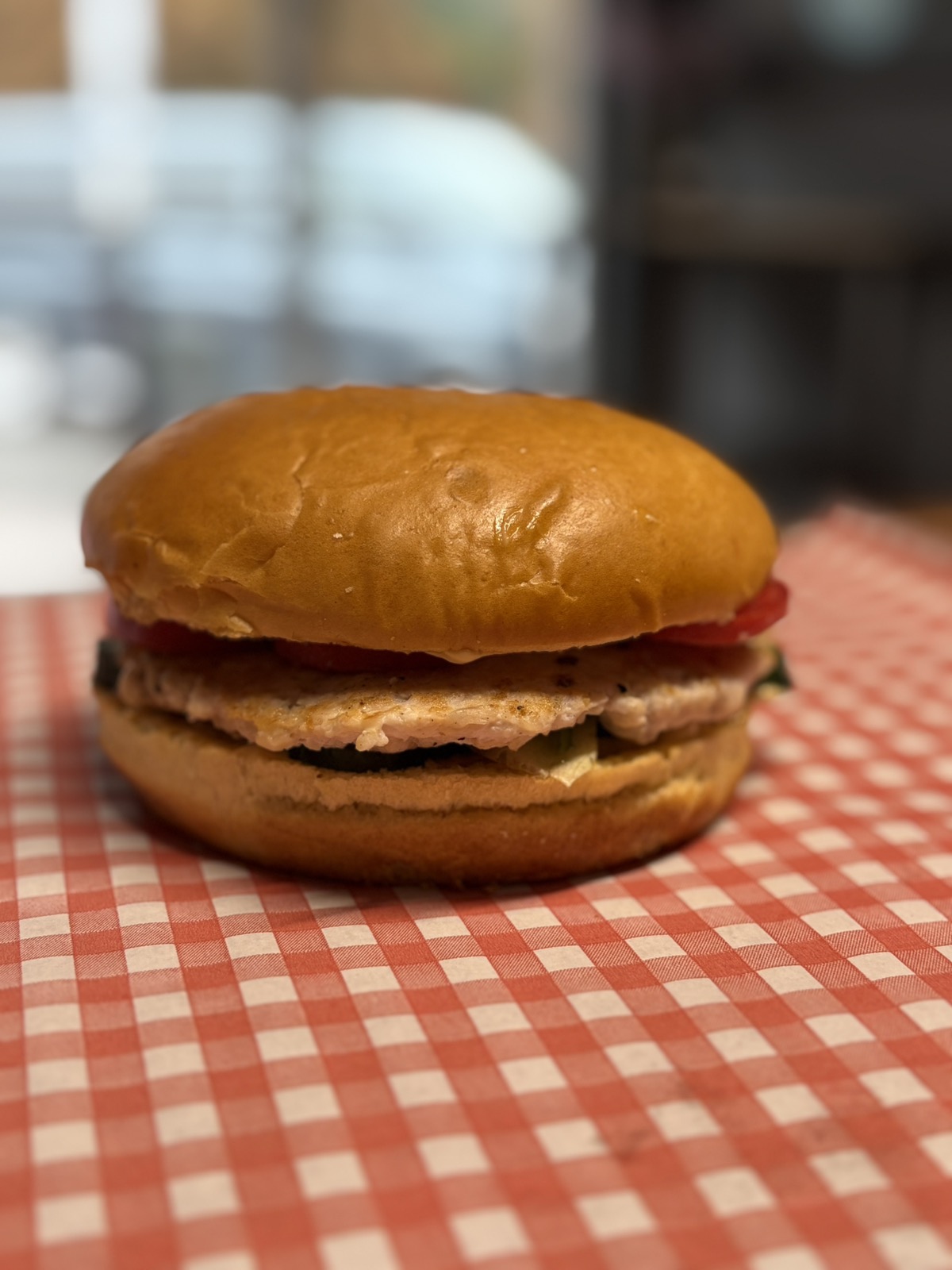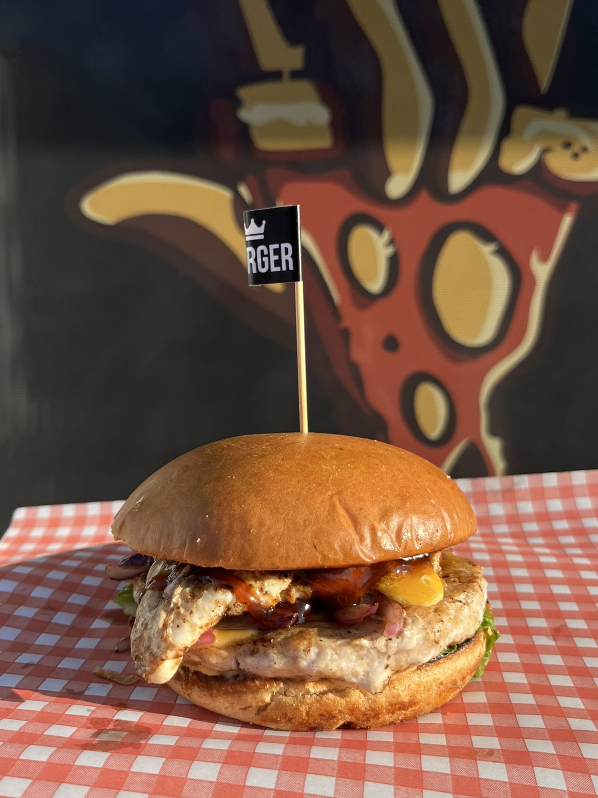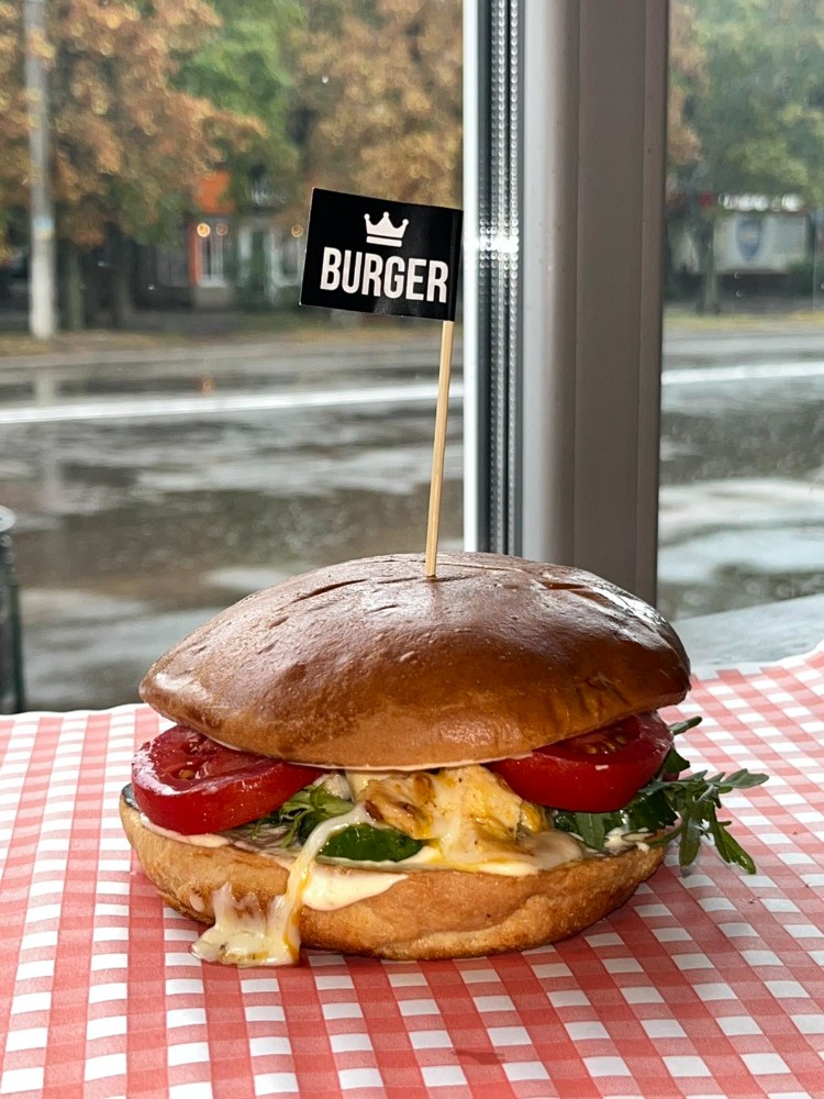 чорна фірмова булочка, соус бургер, котлета яловича 2 шт , капуста пекінка, огірок солоний , помідор свіжий , цибуля сир чедр 2 шм.